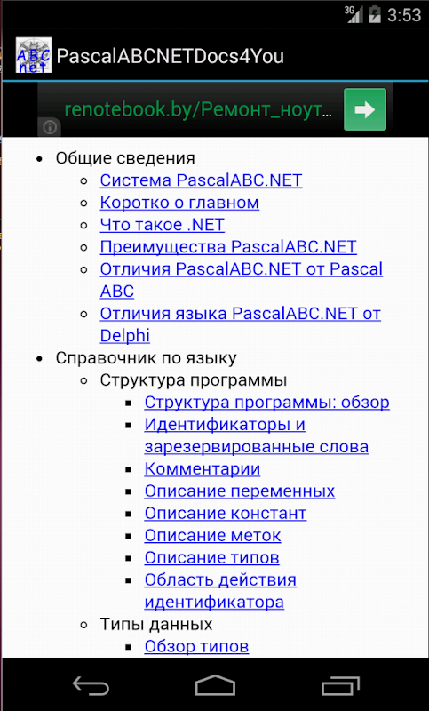 PascalABCNETDocs4You справочник (PascalABC.NET (версия 2.2, сборка 751 от 14.04.2014) Russian) по языку программирования Pascal (Паскаль) является локальной копией оригинальной документации системы программирования PascalABC.NET IDE. Система PascalABC.NET разработана на факультете математики, механики и компьютерных наук Южного федерального университета, активно развивается и используется для обучения студентов в курсе Основы программирования, а также для обучения школьников. PascalABC.NET также активно используется в ряде учебных заведений России и ближнего зарубежья. Справочник предназначен для информационной поддержки при изучении программирования в рамках дисциплины 'Информатика' и 'Прикладная Математика'.