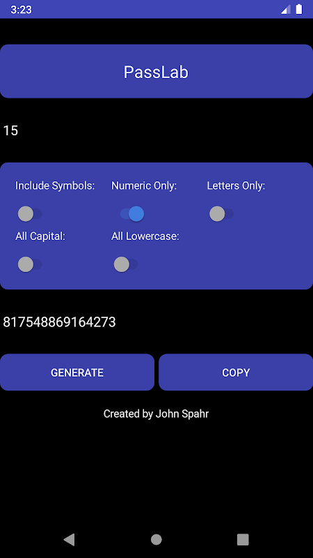 PassLab is an app that creates passwords for you. It offers many premium features for free, such as advanced password customization options. Better yet, PassLab does not have any ads or in-app purchases. PassLab features a beautiful dark theme and user interface, making generating passwords a breeze! If you want to create strong passwords without complications, you'll love PassLab.