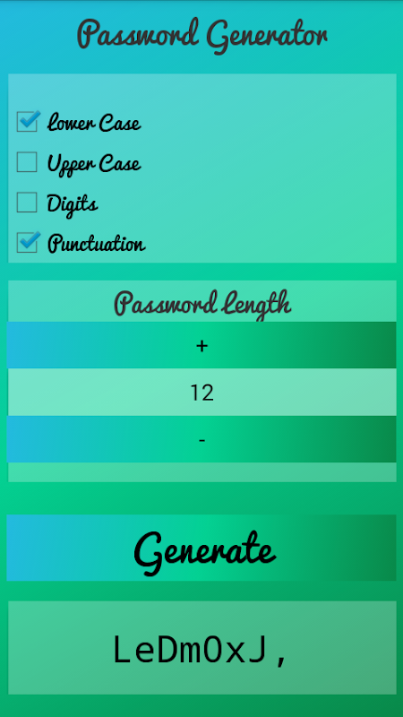 Password Generator is an app for generating secure passwords using cryptographic ally secure pseudo-random number generator. You are given options to choose which characters your password should contain or you can choose your set of a custom symbols. Generating passwords with Password Generator is fast and easy, just check options and hit a button.