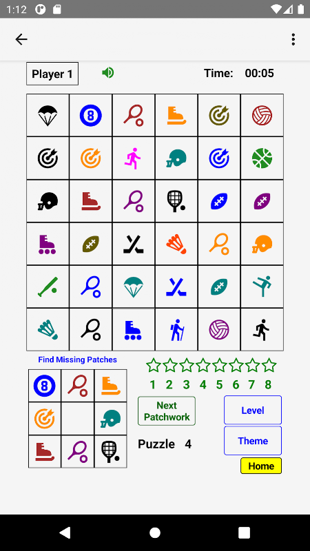 Trois niveaux de difficulté sont intégrés à l'application. Le niveau 1 utilise un grand Crazy Quilt 6 x 6, ce qui permet de faire correspondre relativement facilement le motif [3x3] Patchwork. Le niveau 2 utilise une courtepointe folle 8 x 8; Le niveau 3 utilise une courtepointe 10 x 10. Les niveaux les plus élevés ne représentent pas nécessairement un niveau de difficulté plus élevé, mais il faudra probablement un peu plus de temps pour trouver le modèle. La taille du Patchwork [3x3] est la même à tous les niveaux.