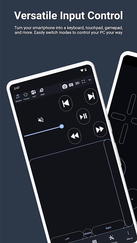 * Contrôle de la souris et du clavier : Utilisez votre téléphone comme souris et clavier sans fil pour votre PC. Naviguez, saisissez du texte et contrôlez votre ordinateur sans effort, où que vous soyez.