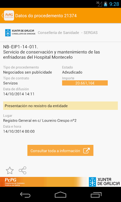 PcPG es una aplicación desarrollada por la Agencia para la Modernización Tecnológica de Galicia (Amtega) que permite la consulta, mediante dispositivos móviles, de la información de la Plataforma de Contratos Públicos de Galicia. Disponible tanto en gallego como en castellano, se actualiza de manera constante con la reutilización de la información procedente de http://www.contratosdegalicia.es, con lo que permite acceder a las últimas publicaciones de la plataforma, a aquellas que se encuentran en plazo de presentación de ofertas, a las pendientes de adjudicar, a las que se encuentran en los últimos días de plazo de presentación y a las próximas mesas de contratación. Incluye también la opción de consulta de los diferentes perfiles de contratante y la posibilidad de señalar determinados procedimientos como favoritos para facilitar su seguimiento.