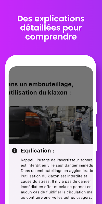 Accédez à une vaste banque de questions constamment mise à jour, qui reflète l'examen réel du permis de conduire. Nos questions couvrent tous les aspects du code de la route, des panneaux de signalisation aux pratiques de conduite sécuritaires, vous fournissant les connaissances nécessaires pour aborder l'examen en toute confiance.