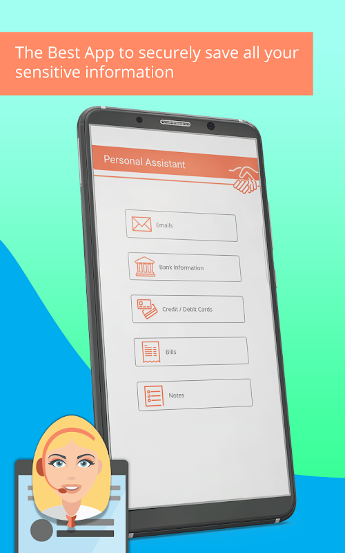 Personal Assistant records and protect all your confidential mobile data and personal information in form of your credit cards pin code and debit cards Password & pin code in a highly trusty manner with a manual protection methodology or techniques, Personal Assistant has the many skins of Personalize background color (Pink, Purple, Blue) and that can freely Change text-size and font-style with multi colors android themes and background wallpaper, Personal Assistant can also facilitate all android users with an automatic reminder option to write and record all his/her personal data inform of Bank ATM card pin cod and other personal Bank account number and Daily home financing activities too