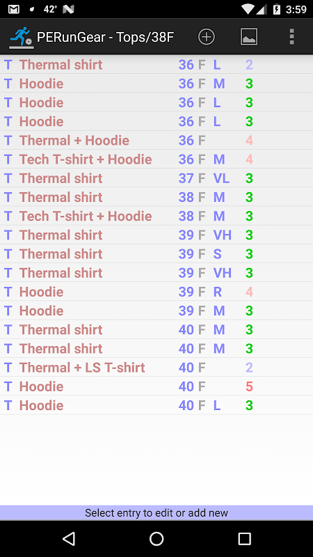 This app helps you decide what running attire to wear in cold weather. You enter descriptions of your run-wear -- hats, gloves, shirts, shorts, thermals, etc. The next time you go running, make note of what you wore and how it felt. After just a few entries, a useful database will be developed which you can consult to help you decide what to wear on future runs. Data can be backed up to DropBox, which also allows sharing of data with other devices. A free Windows app is also available for download, to allow you to access data from your PC.