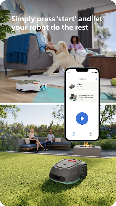 Rentrez chaque jour chez vous pour nettoyer vos sols et avoir un jardin impeccable en utilisant votre robot aspirateur, laveur et tondeuse à gazon Philips HomeRun en combinaison avec l'application. Configurez-le une seule fois – pour nettoyer chaque pièce et tondre votre pelouse comme vous l’aimez – appuyez sur « Démarrer », à tout moment et en tout lieu, et laissez votre robot faire le reste.