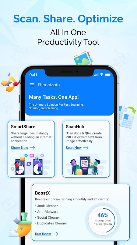 • Solution tout-en-un : Phonemate combine le partage de fichiers, la numérisation de documents et l'optimisation des appareils dans une application unique et pratique.