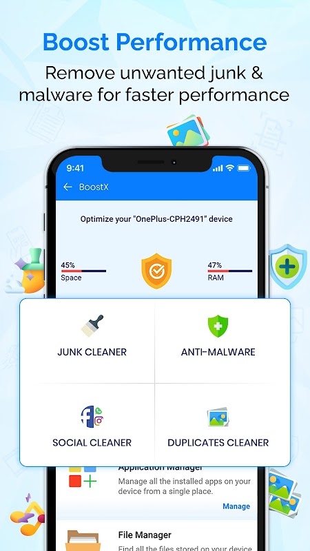 • Junk Cleaner : supprimez tous les fichiers indésirables et inutiles qui occupent de l'espace sur votre téléphone et le ralentissent.