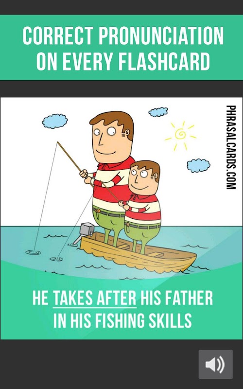 Dans notre application, vous trouverez 500 flashcards contenant des significations du verbe phrasal, par exemple des phrases, des images et prononciation correcte.