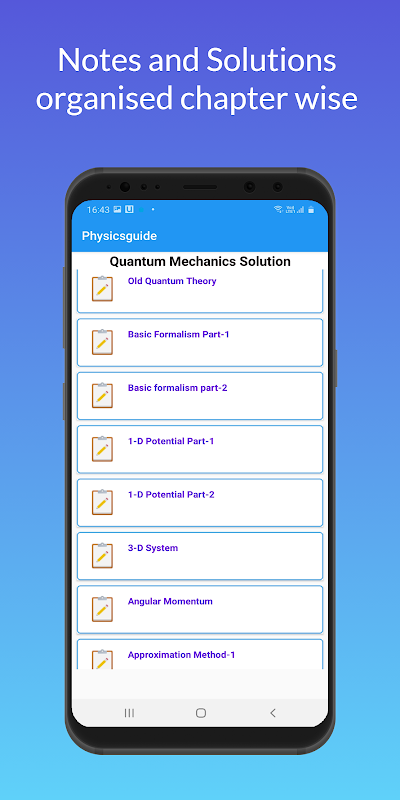 Dans cette application, les étudiants trouveront des notes par chapitre, ainsi que les problèmes et solutions de tous les examens des années précédentes, classés par thème et par difficulté croissante des concepts. Tous les concepts pertinents sont abordés dans les notes, avec les exemples requis. La section « problèmes et solutions » de l'année précédente présente les questions posées lors de tous les examens d'entrée en physique indiens résolus en détail.