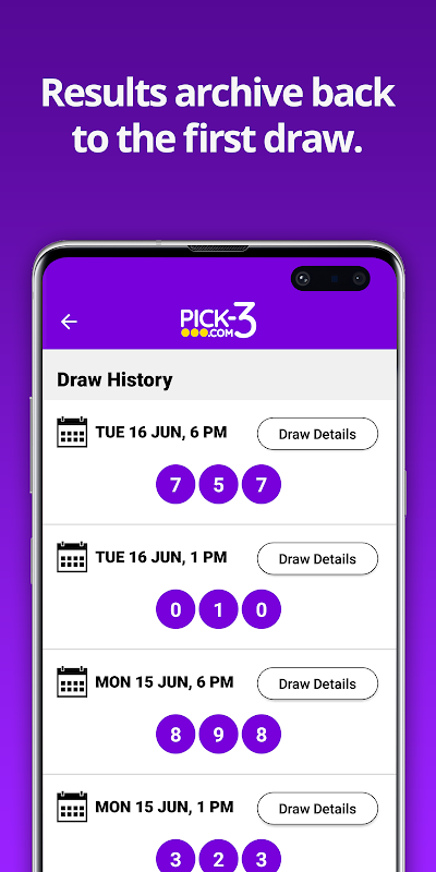 Recevez une notification instantanément lorsque les derniers résultats de Pick 3 et la répartition des prix seront disponibles. L'application vous permet de personnaliser les notifications pour les jours de la semaine auxquels vous participez. Il y a aussi la possibilité de définir des notifications aux moments qui vous conviennent - idéal pour vous rappeler de placer un pari avant le résultat.