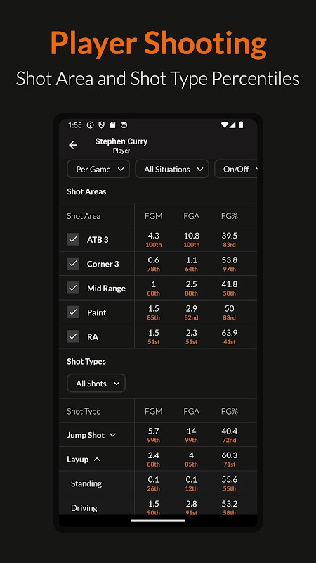 Centiles de tir : explorez davantage vos joueurs préférés en comparant la façon dont ils tirent depuis le terrain ! Les percentiles pour chaque joueur de la ligue sont disponibles pour chaque tir sur le terrain, y compris : les tirs à trois points au-dessus de la pause, les tirs à trois points en coin, à mi-distance, la peinture et la zone restreinte. Et allez encore plus loin en regardant le profil de quelqu'un comme : step-backs, floaters, cut layups, alley-oop dunks, et bien d'autres encore !