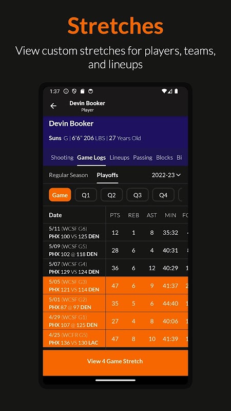 Filtrage activé/désactivé personnalisable : choisissez n'importe quelle combinaison de joueurs de votre équipe préférée pour voir leurs performances en direct dans le jeu, tout au long de la saison régulière ou des séries éliminatoires, et dans n'importe quelle séquence de matchs. Modifiez davantage en filtrant les joueurs adverses en même temps !
