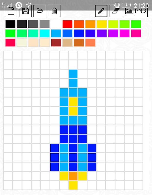 Once it's done you can export your 8 bit style pixel graphic out as a PNG image to your phone or tablets gallery, and if you want to work on it later you can save it too. Perfect for passing a spare few minutes, and creating graphics that look like they were from the golden era of arcade machines.