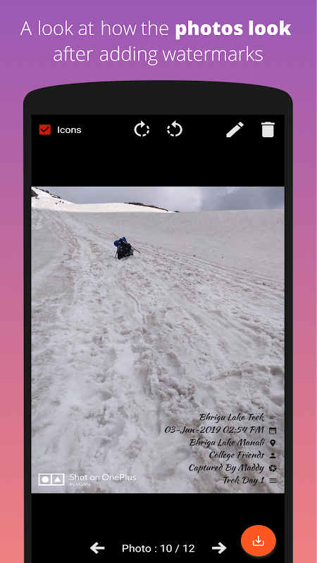 PixMark vous permet d'ajouter les détails de votre voyage dans un grand nombre de photos en un seul clic. Vous pouvez ajouter les détails que vous souhaitez ajouter à vos photos sous forme de filigrane. Entrez simplement le texte que vous souhaitez ajouter, sélectionnez les photos de votre galerie et enregistrez toutes les photos en une seule fois en un seul clic.