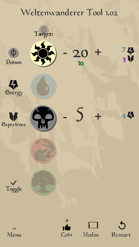 Caractéristiques: compteur de vie, Poison / Energie / compteur d'expérience, toutes les fonctionnalités de Planechase, de pièces et tossing lancer de dés.