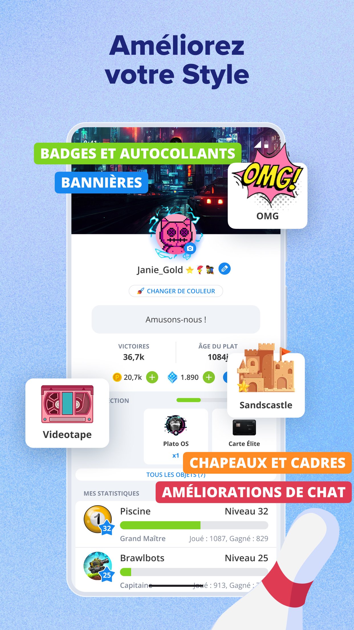 ● Paradis de la personnalisation : personnalisez votre profil, les thèmes de chats de groupe et les expériences de jeu pour vous approprier Plato.