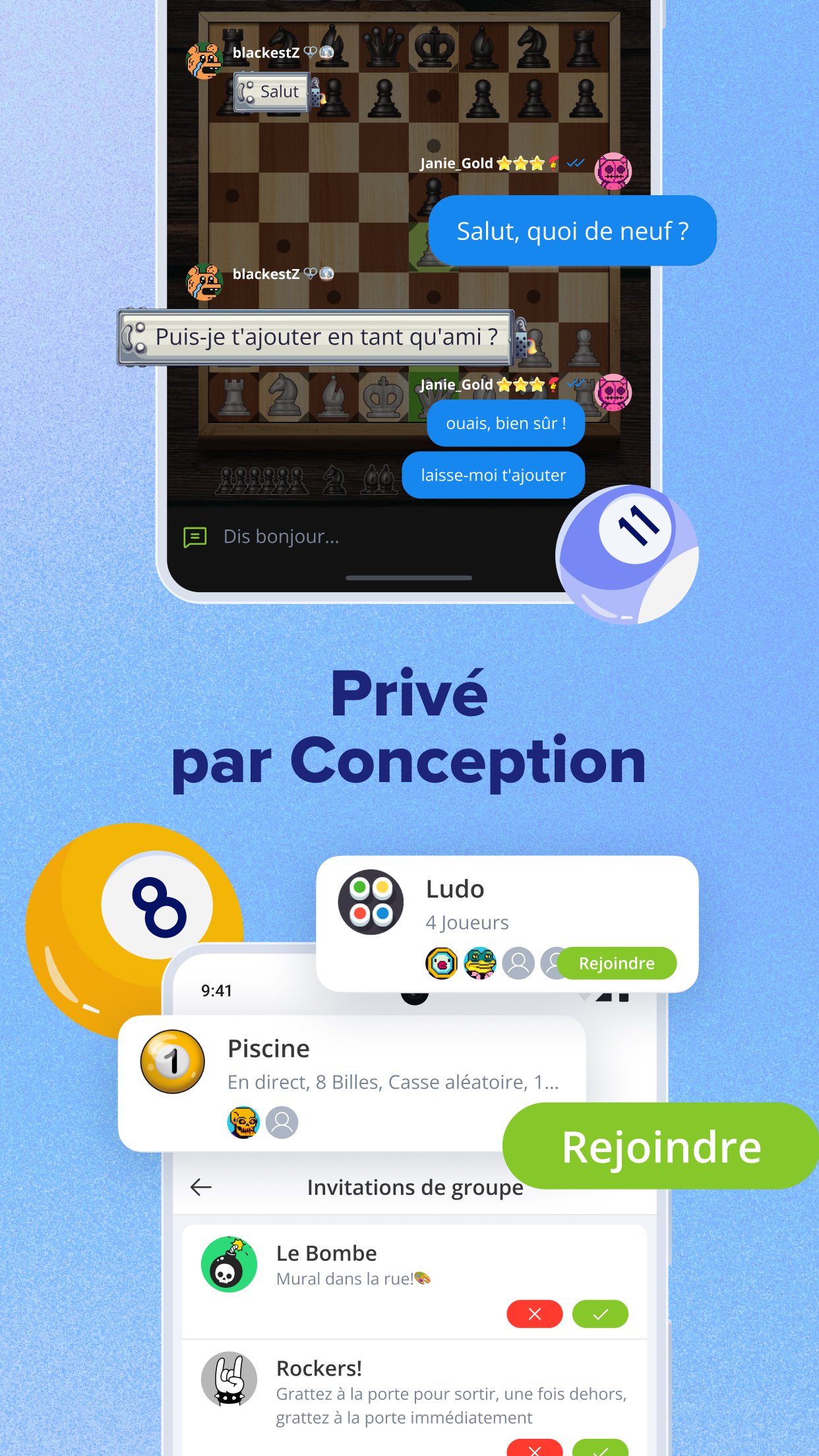 ● Respect de la vie privée : nous ne recueillons pas de données inutiles, vous pouvez donc jouer et bavarder en toute tranquillité.