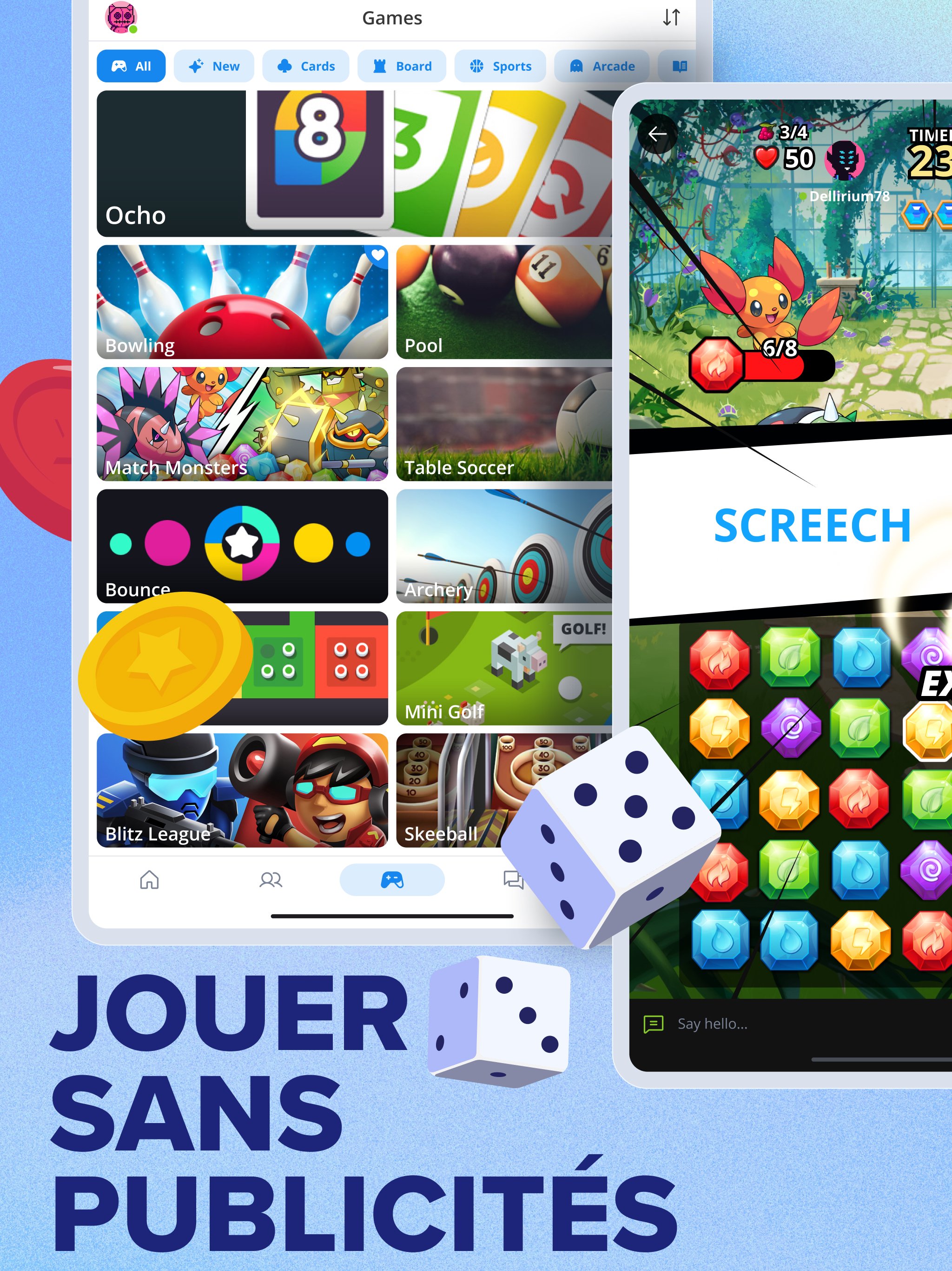 ● Un tas de jeux : avec 50 jeux multijoueurs de premier plan, tels qu’Ocho (Crazy Eights) 8️⃣, Billard 🎱et Babyfoot⚽ vous trouverez toujours un jeu sympa pour vous amuser. Que vous préfériez les jeux de stratégie, les sports ou les jeux de société classiques, nous avons tout ce dont vous avez besoin.