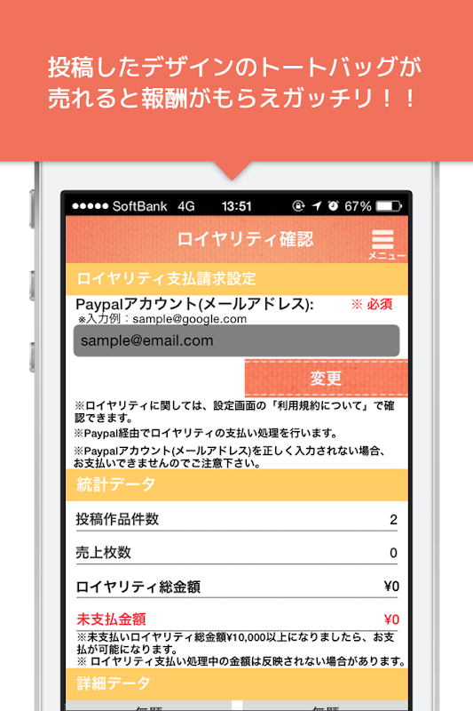 あなたの作品にファンがつき、そのファンがトートバッグを購入したら1個につき200円のロイヤリティを得る事ができます。