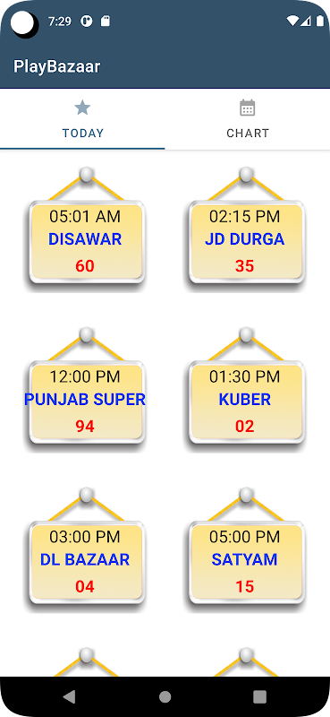 Application PlayBazaar - Tableau des résultats et résultat rapide du jeu