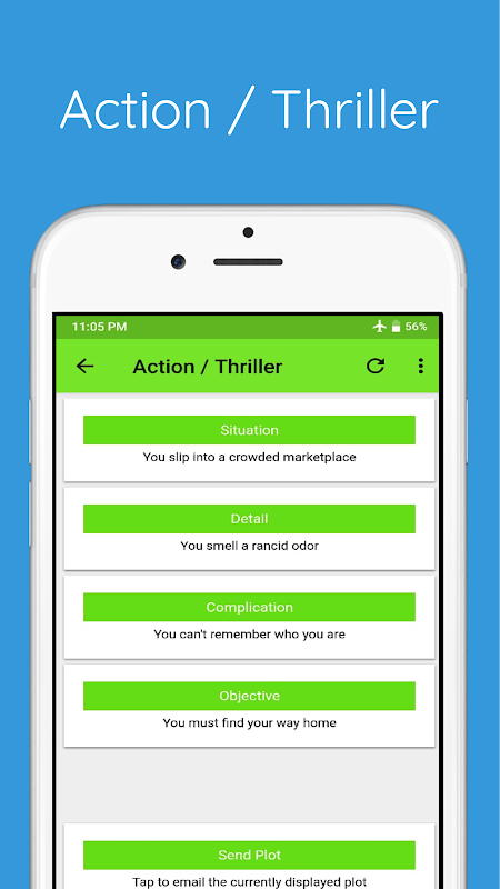 L'application Free Plot Generator - Random Story ne peut pas créer un graphique détaillé complet; il peut simplement permettre à l'écrivain de proposer des idées.