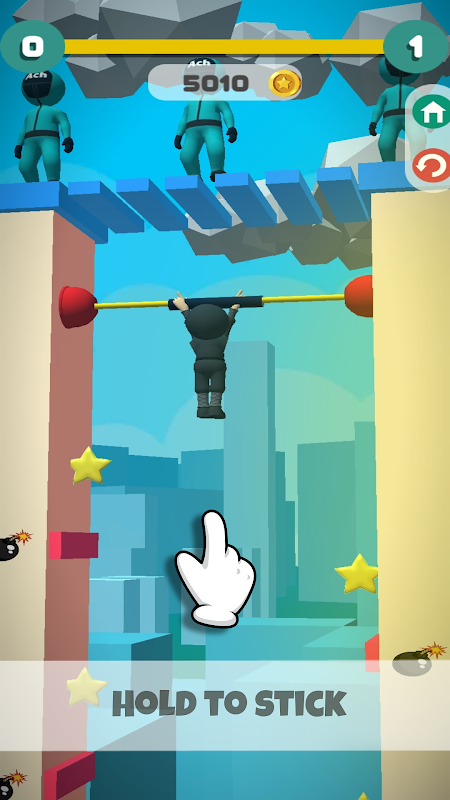Les mécanismes de jeu sont simples et captivants : les joueurs doivent rester collés aux murs en appuyant longuement sur l'écran, tout en synchronisant leurs mouvements pour éviter les piques, les bombes et autres dangers. Le but de chaque niveau est de se diriger en toute sécurité vers la zone d'arrivée verte, en utilisant des ventouses pour se coller aux murs et en déjouant les gardes qui vous poursuivent.