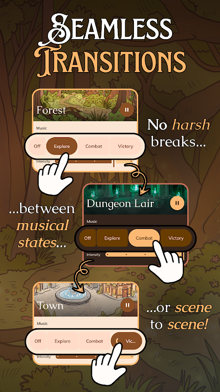 Pocket Bard offre une expérience audio totalement immersive pour vos parties de RPG sur table. D'un simple toucher, modifiez l'ambiance sonore pour l'adapter à votre session : passez de l'exploration à la musique de combat en toute fluidité grâce à un seul bouton. À chaque instant, utilisez le curseur d'intensité pour modifier l'arrangement de la musique et des effets sonores et les adapter parfaitement à votre gameplay.