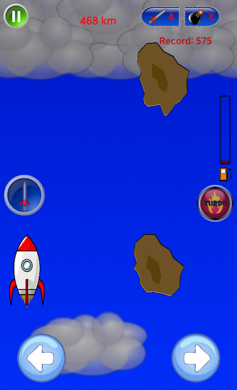 You can drive using the buttons on the screen, or by movements, using the accelerometer of your Smartphone. The control of the rocket by the accelerometer is amazing! Try to fly your Rocket through the accelerometer sensor!