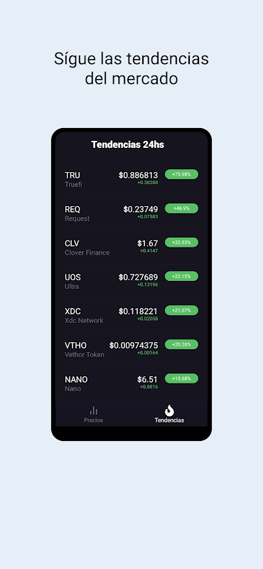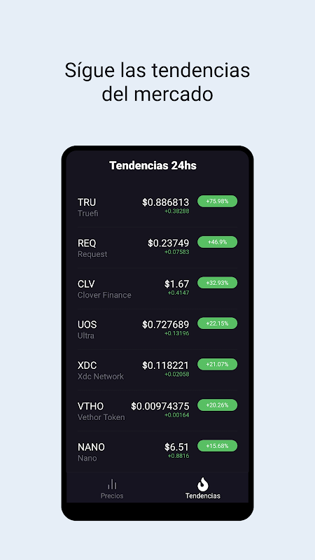 La función "Tendencias" te permitirá saber cuales son las criptomonedas que más han crecido en las últimas 24 horas.