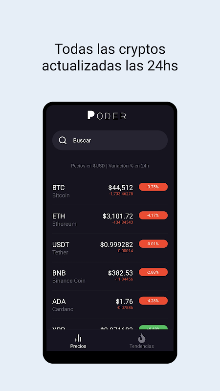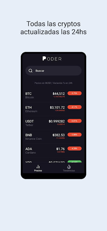 Poder es una App que te permite visualizar el precio de las principales monedas del mercado según su capitalización en el mercado.