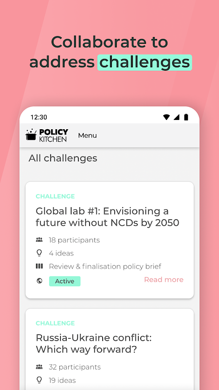 Grâce à l'application Policy Kitchen, vous pouvez désormais soumettre vos idées de politique, collaborer et vous connecter avec des experts et des passionnés de politique internationale depuis votre téléphone: