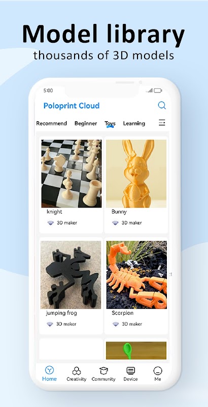 Poloprint Cloud fournit des milliers de modèles 3D en ligne. Sélectionnez et cliquez simplement, le système découpera le modèle dans le cloud et l'enverra automatiquement à votre imprimante 3D pour l'impression.