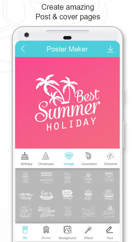 Poster Maker is an app specifically for designing posters. With one click, you can select sizing that's perfectly scaled for a your poster, so you don't have to hassle with resizing an image. Create promotional posters, advertisement, offer announcements, cover photos on the go with amazing backgrounds, texture, effects, fonts, sticker and get the attention you want.