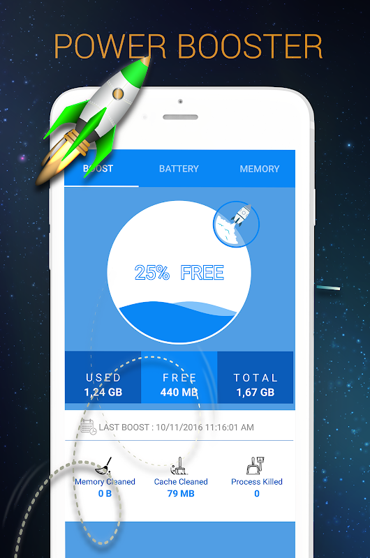 Power booster and Battery saver: 2-in-1, check your Android devices by it's RAM* usage status, indicates the "random access memory" cleaned in percentage.
