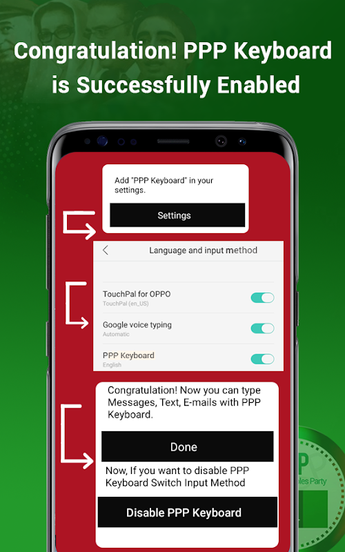 PPP Keyboard is specially design for PPP Lovers or those who want to write text SMS in Urdu and English. You can easily write funny SMS or poetry. PPP Keypad include PPP animated layout keyboard. Select the animation and choose the flag which is your favorite one and use as a keyboard theme. This Easy Keyboard has unique and beautiful themes, including animation themes which have PPP flag keyboard as background. The keyboard layouts are responsive with different device screen sizes and have layouts for landscape version. PPP Urdu keyboard is a complete solution for All English, Pashto and Dari (Farsi) national languages along with native numbers and symbols.