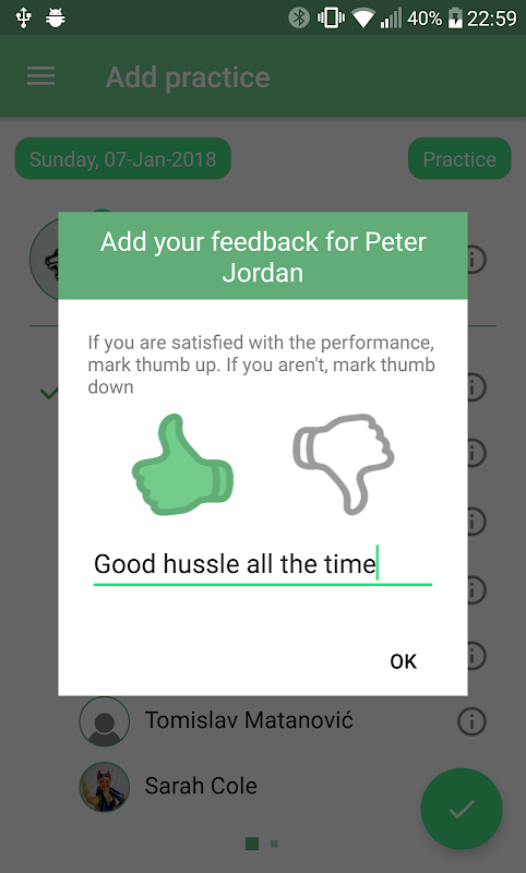 Cette application permet de créer plus d'une équipe et d'ajouter tous les membres de l'équipe. Il permet aux entraîneurs d'ajouter plusieurs enregistrements d'entraînement chaque jour et de vérifier les dates des entraînements survenus dans la section calendrier. Ils peuvent également ajouter des commentaires sur l'entraînement et les joueurs.
