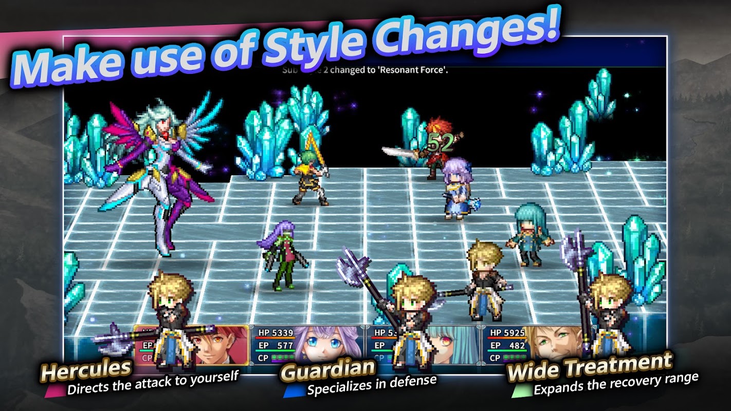 Utilisez jusqu'à trois styles pour chaque personnage lors de combats au tour par tour afin de bénéficier des avantages de la récupération et des styles de combat. Augmentez vos niveaux d'Énergie en élevant plusieurs élémentaires uniques à la série Alphadia et apprenez de nouvelles compétences. La compétence combinée appelée Compétence Résonnante est également la clé de la victoire.