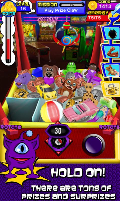 Approchez-vous de la machine et manœuvrez la pince pour attraper des pièces, des gemmes, des peluches, des voitures, des poupées et bien plus encore ! Ce jeu de pince est bien plus qu'un simple jeu d'arcade classique : PRIZE CLAW regorge d'objets uniques, d'effets puissants et de missions stimulantes. Des gemmes spéciales vous accordent des bonus pour améliorer votre collection, et vous pouvez échanger les prix que vous collectez contre des bonus spéciaux. Et ce n'est pas tout : toutes les pièces que vous collectez peuvent être dépensées pour améliorer votre pince, activer vos pouvoirs uniques et même personnaliser votre machine ! Si vous êtes à court de récompenses, pas d'inquiétude ! Vous en recevrez bientôt d'autres. Revenez régulièrement pour compléter votre collection et débloquer plus d'objets !