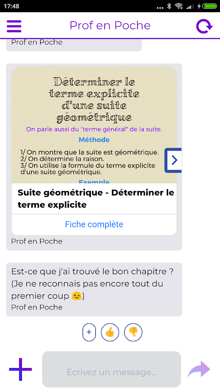 Exactement comme si tu demandais de l'aide à un ami, tu peux demander de l'aide à Prof en Poche, qui te répondra 24h/24 et 7j/7.