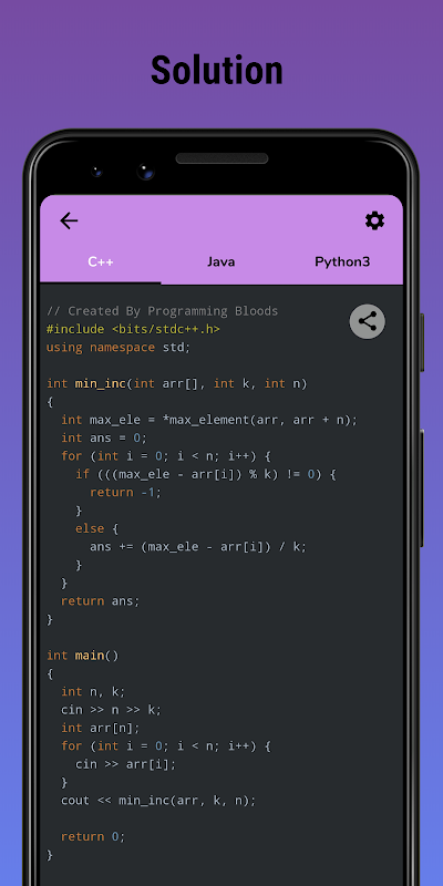 Best Feature of this app is you can share any programming problems with your friends in any language(C++, Java, Python3).