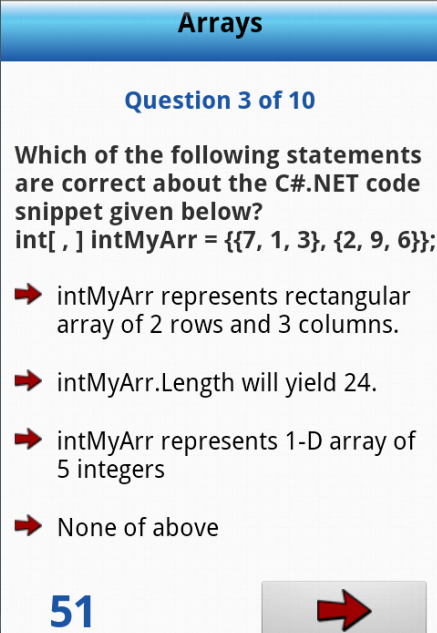 Cette application a deux grands quiz linguistiques. Java et C #. Les questions sont regroupées en plusieurs catégories, de sorte que vous pouvez essayer questionnaire après avoir terminé un chapitre de votre livre ou matériel de cours.