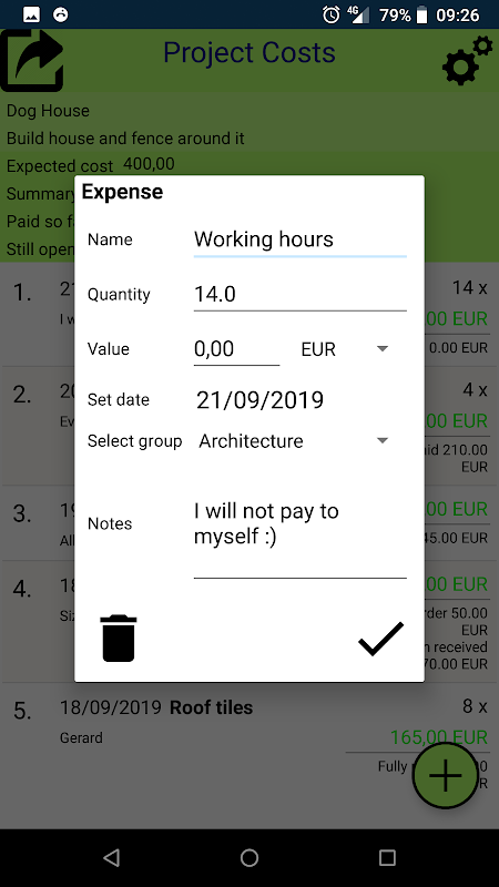 Avec l'application mobile Project Costs, vous pouvez également ajouter manuellement des paiements. Ceci est utile lorsque vous avez un entrepreneur qui fait une partie de votre travail et que vous en payez une partie à l'avance et une fois qu'ils ont terminé leur travail. De cette façon, vous pouvez voir combien et quand il a été payé.