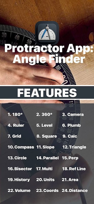 Utilisez le rapporteur numérique, le rapporteur d'angle, la règle et le rapporteur caméra pour mesurer des angles de 180° et 360° avec une grande précision. Faites pivoter, zoomez et alignez facilement les objets pour les mathématiques, la menuiserie ou vos tâches quotidiennes.