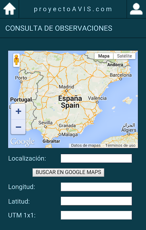 Les observations sont géographiquement situés dans 10x10 km grille, suivant le système UTM-MGRS coordonner. Avec l'application, nous pouvons obtenir notre position actuelle dans ce format en utilisant la capacité de localisation de notre dispositif de recherche ou les coordonnées de tout point via Google Maps.