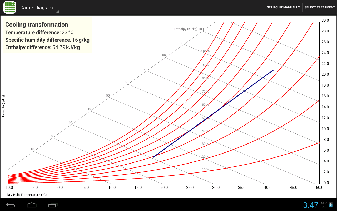 Free psychrometric utility App, very useful for all HVAC producer. By tapping once on the chart, it lets you calculate the Air Specific Humidity, Relative Humidity and Enthalpy of a specific point. Instead if you drag a point to another, it lets you calculate air treatments like Heating, Cooling, Humidification and Steam Humidification.