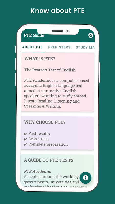 PTE Guide est une application complète de préparation à l'examen Pearson PTE avec des modèles PTE, des tests fictifs PTE, des pratiques de test PTE, des trucs et astuces PTE et du matériel d'étude pour l'examen PTE.