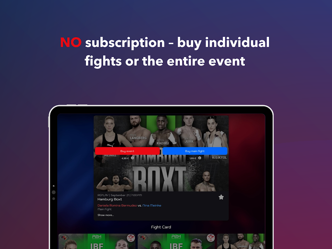 Bienvenue sur PunchZone, l'application ultime pour les fans de boxe ! Vivez des événements de boxe en direct du monde entier – plus flexibles et abordables que jamais.