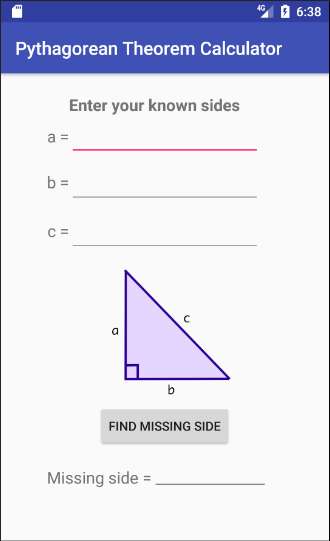 - Enter two sides and the app will calculate the third side