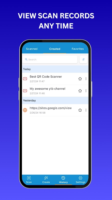 Application de scanner de code QR gratuite et complète pour les appareils Android qui prend également en charge la numérisation et la création de codes QR et de codes-barres dans différents formats. 100% gratuit et facile à utiliser.